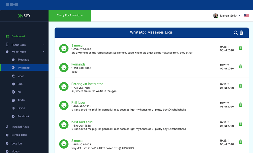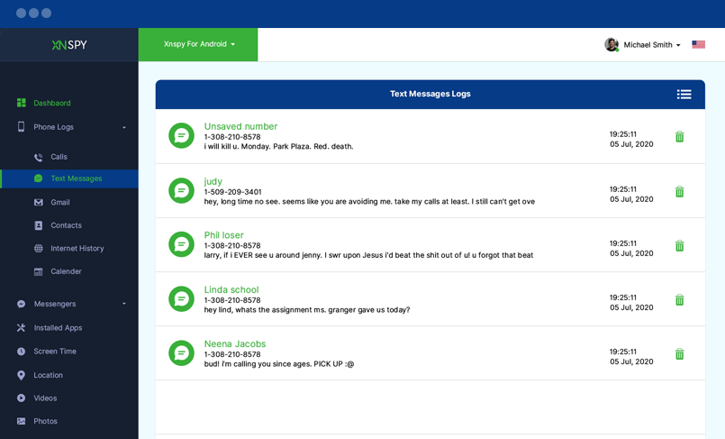 İşte hedef cihazda gönderilen ve alınan tüm mesajlar. Metin mesajlarını okuyabilir ve gönderenin adını ve numarasını, saat ve tarih damgalarıyla birlikte görüntüleyebilirsiniz.