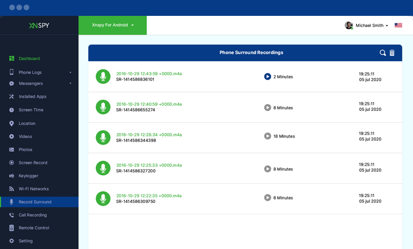 Hedef cihaz çevrenizin tüm kayıtlarının listesi burada. Kayıtların üzerine tıklayarak tüm kayıtları dinleyebilirsiniz. Her kaydın saat ve tarih damgalarını görüntüleyebilirsiniz. Kayıt özelliğini uzaktan etkinleştirmek için soldaki uzaktan kumanda sekmesine tıklayın.