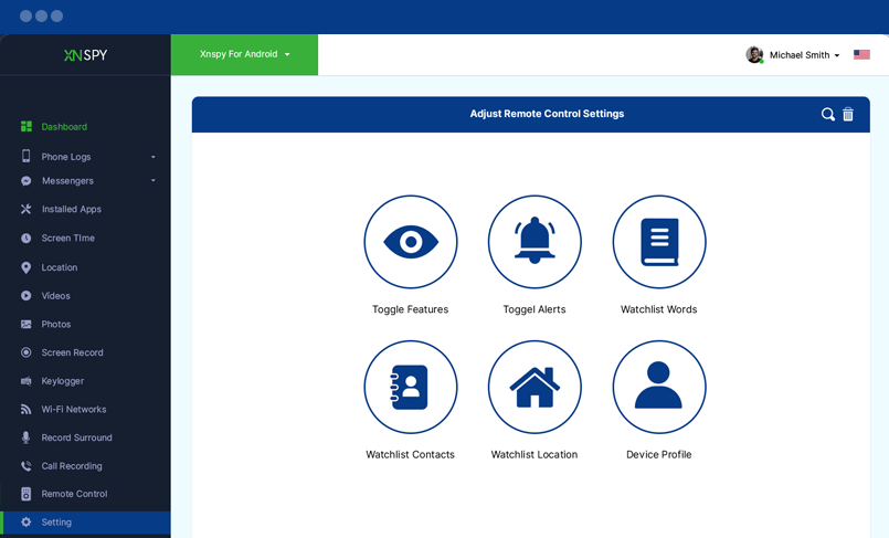Burada, çeşitli XNSPY özelliklerinin ayarlarını yapmak için aşağıdaki bölümlerden birini seçebilirsiniz. Özellikleri, işlevlerini ve etkin cihaz profillerini görüntüleyin ve düzenleyin.