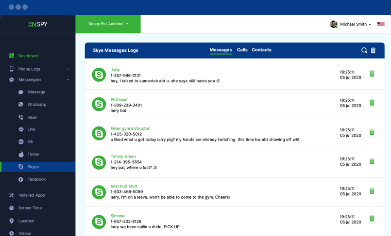 Skype kişilerini ve günlüklerini buradan kontrol edebilirsiniz. Skype Kişilerini, Çağrıları ve Sohbetleri izlemek için ilgili sekmelere tıklayın. Ayrıca her arama ve mesaj için Skype kimliklerini ve saat ve tarih damgalarını da görüntüleyebilirsiniz.