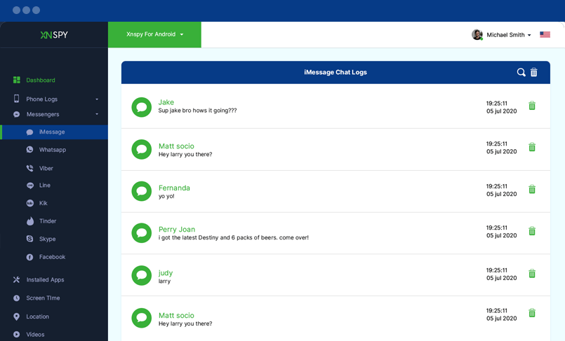 İşte hedef cihazın iMessage sohbet günlükleri. Gönderilen ve alınan tüm mesajları, her sohbet için tarih ve saat damgalarıyla birlikte okuyabilirsiniz.