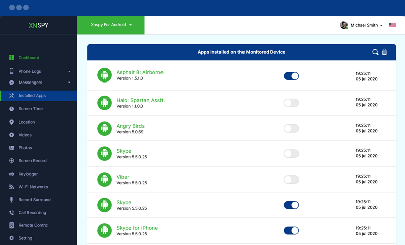 Hedef telefona veya tablete yüklenen tüm uygulamaların listesi burada. Uygulama adlarını ve sürümlerini, her uygulama için yükleme saati ve tarihi ile birlikte görüntüleyebilirsiniz.